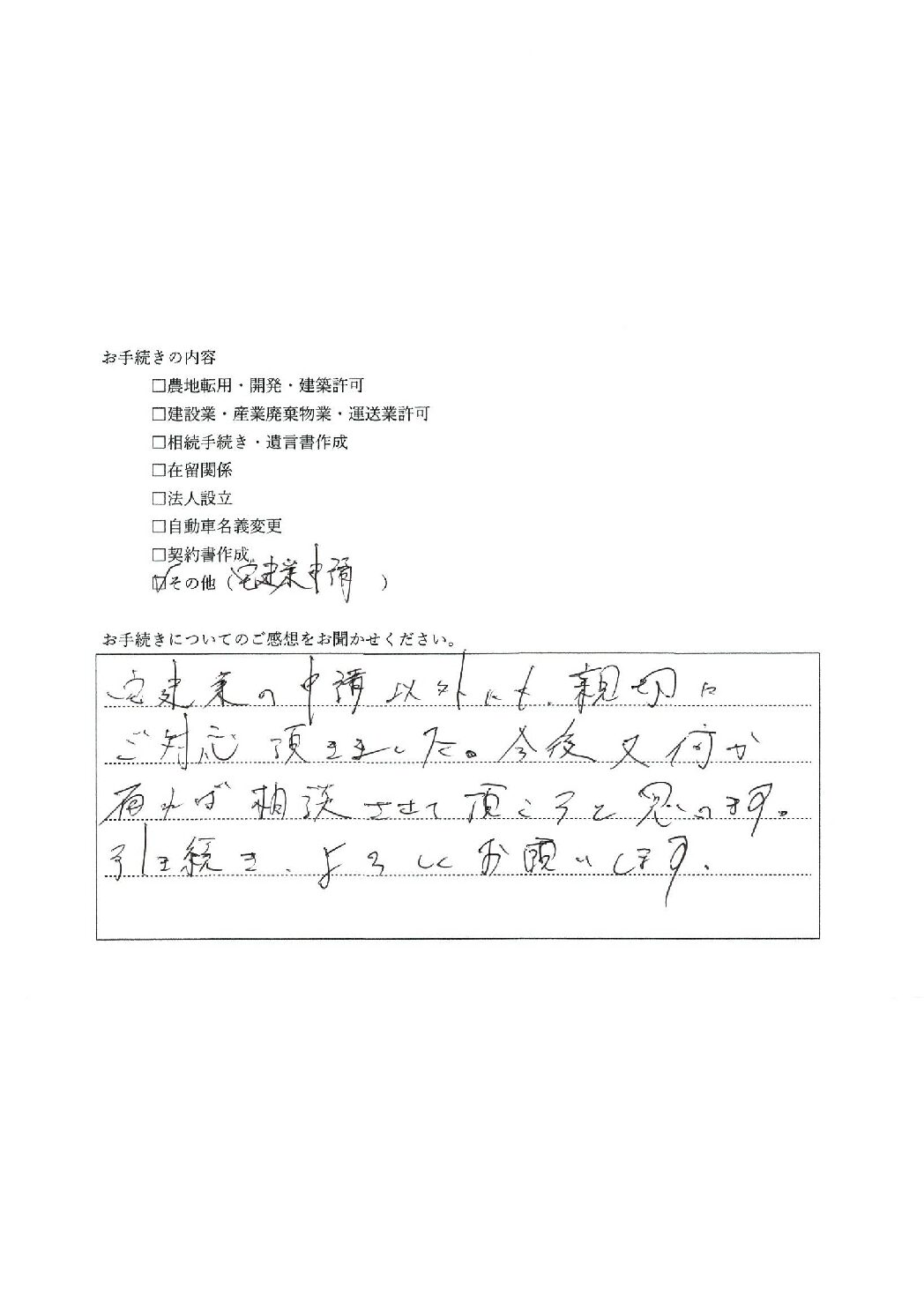 この度はご依頼いただきましてありがとうございました。不動産を反復継続して売却をする場合には宅建業者として業者免許を取得しなければなりません。今後の展望に沿った許可を取得出来て安堵しております。今後ともよろしくお願いいたします。