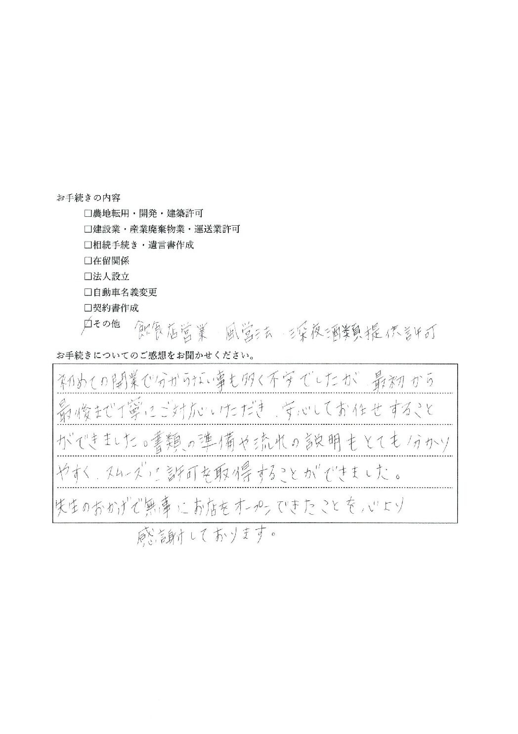 この度はご依頼いただきありがとうございました。今回は風営法許可申請ではありませんがお店の場所が中区の繁華街であり商業地域のため、0時以降のお客様がいらっしゃったり、万が一に備えての届出を行うということでしたので、そのようなお考えはとても素晴らしく思いました。今後、お店の設備の入れ替えが必要になった場合に所轄に変更届を提出しないといけない可能性がありますので、その際はお声がけください。よろしくお願いいたします。