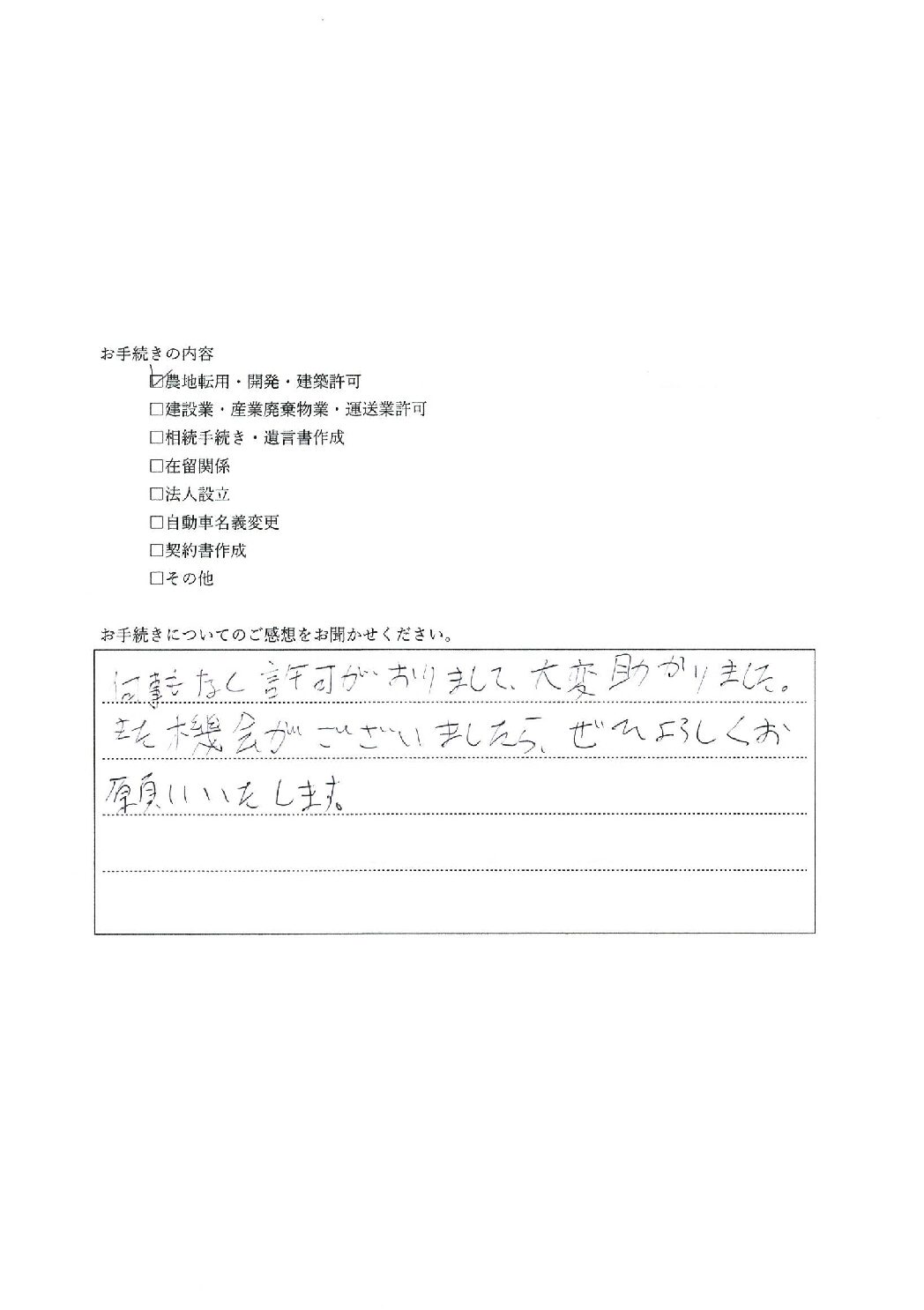 この度はご依頼いただきありがとうございました。今回の手続きでは付帯する許可(承認工事や雨水浸透阻害行為許可)が不要でしたので、5条許可のみの申請となりました。無事に駐車場が増設されることを願っております。今後ともよろしくお願いいたします。
