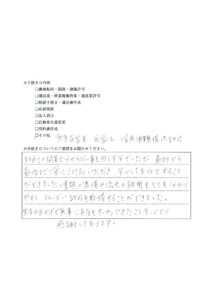 行政書士事務所ラクレアより この度はご依頼いただきありがとうございました。今回は風営法許可申請ではありませんがお店の場所が中区の繁華街であり商業地域のため、0… -
