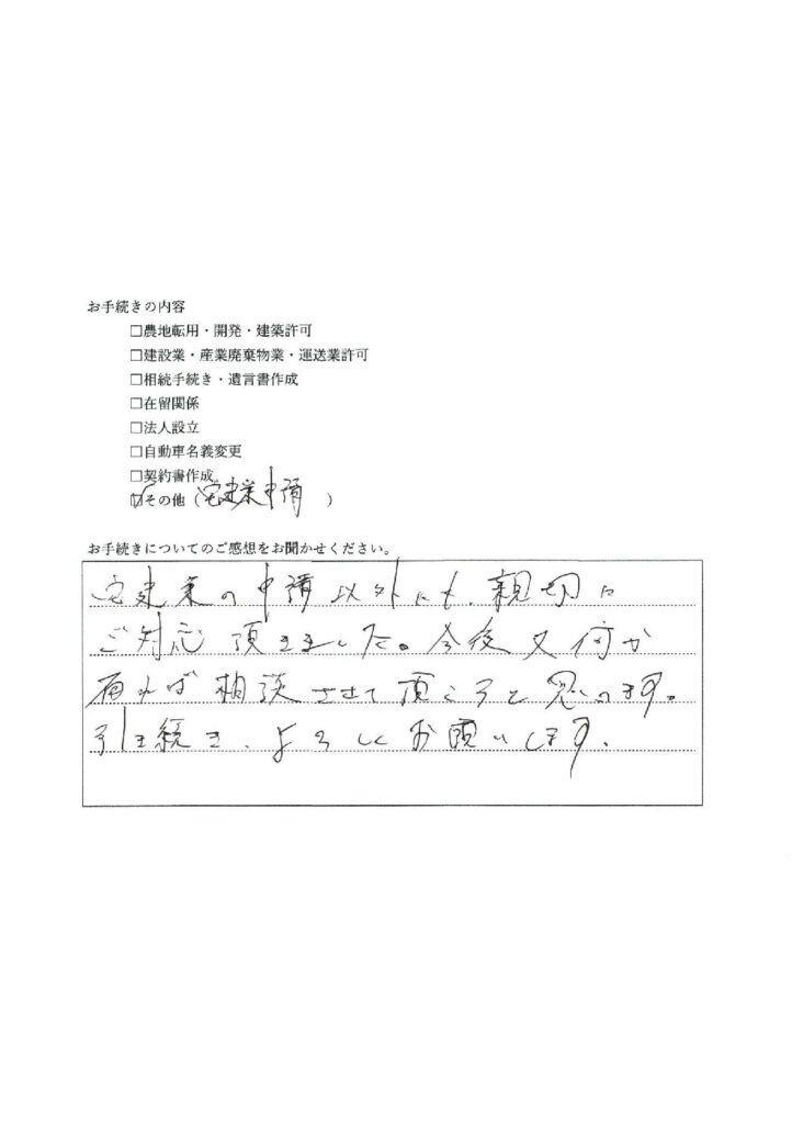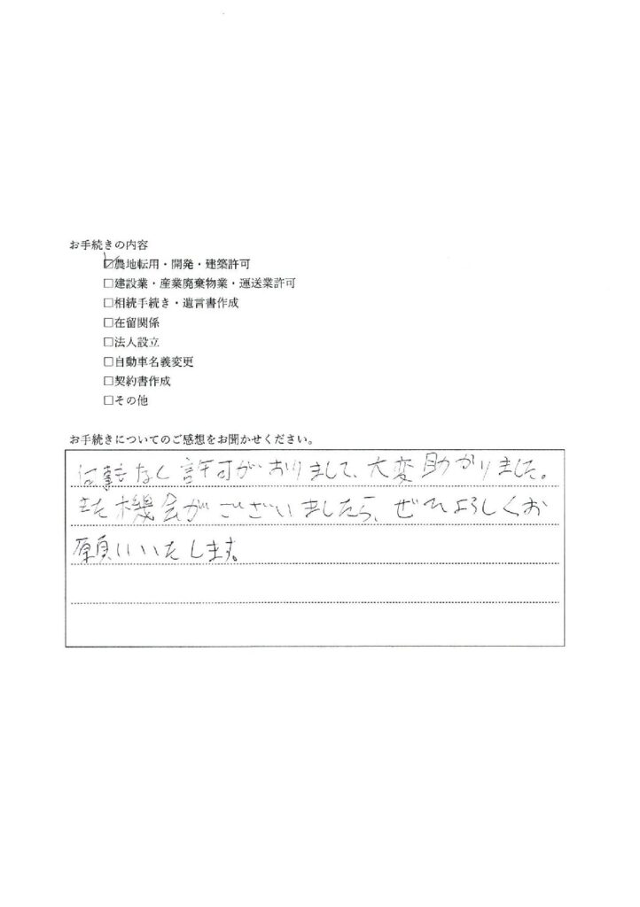 行政書士事務所ラクレアより この度はご依頼いただきましてありがとうございました。今回は市街区域の手続きになるため受理委通知書取得までの期間が短く、手続き自体も… -